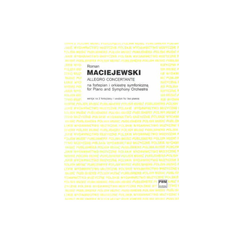 'Allegro concertante'' to utwór na fortepian i orkiestrę symfoniczną powstały w 1944 r. w czasie, gdy Kompozytor przebywał w Szwecji. W pierwotnym zamierzeniu miało ono stanowić pierwszą część planowanego koncertu fortepianowego, a skomponowana wkrótce potem ''Kołysanka'' na fortepian i orkiestrę - część drugą. Ostatecznie Kompozytor zaniechał tego zamiaru, pozostawiając wykonawcom swobodę, co do koncepcji wykonań (w przypadku wykonywania łącznego obu utworów przyjęło się rozpoczynanie powolną ''Kołysanką'' jako wstępem do wielkiego ''Allegra''). Niniejsza postać utworu ''Allegro concertante'' jest oryginalną wersją Kompozytora, w której partia orkiestry sprowadzona została do partii drugiego fortepianu. Brak elementu kolorystyki orkiestrowej, z natury rzeczy absorbującego ucho słuchacza, czyni bardziej wyrazistym partnerskie dialogowanie obu partii, pozwala też skupić większą uwagę na zawiłościach harmoniki. Forma utworu, to tradycyjne allegro sonatowe z ekspozycją, przetworzeniem i repryzą. Kilkadziesiąt taktów wstępu przygotowuje pojawienie się pierwszego tematu o charakterystycznej motywice (grupa szesnastkowa i synkopy), będącej znakomitym materiałem do przetworzeń. W części utworu bazującej na tym materiale aż roi się od progresji z niuansami chromatyczno-harmonicznymi, od zmian trybu durowego na molowy, od ostrych współbrzmień o charakterze groteskowym. Całkowitą zmianę nastroju przynosi pojawienie się drugiego tematu, wykorzystanego następnie przez Kompozytora w repryzie jako materiał, z którego zbudowana została kadencja o wyjątkowej głębi wyrazu. Utwór wieńczy efektowna, wirtuozowska koda. Materiał dźwiękowy, podobnie jak w innych utworach fortepianowych Maciejewskiego, niesie ogromne bogactwo inwencji; czerpiąc z tego, co najlepsze i najcenniejsze w literaturze fortepianowej od baroku po współczesność [wiek XX], Kompozytor tworzy własnym językiem, błyskotliwym, niekiedy brawurowym, pełnym niespodzianek, w którym spiętrzenia chromatyczne sąsiadują z klarownymi przebiegami i współbrzmieniami mono- i politonalnymi, rozciągnięty do skrajnych rejestrów ambitus - z prostym jedno- czy dwugłosem w środkowym rejestrze, szesnastkowe szeregi pełne są zaskakujących akcentów, a pozornie gładkie gamki nieoczekiwanie załamują się. Wszystko to utrzymane w ryzach bezwzględnej logiki formy, stawia przed wykonawcami wymagania kunsztu artystycznego i doskonałej techniki. Niniejsza edycja przygotowana została na podstawie autografu. Rozbieżności w fortepianie solo między partyturą a wersją na dwa fortepiany są wynikiem zmian, które wprowadził sam Kompozytor. Wydawca dokonał jedynie korekty nielicznych oczywistych błędów i przeoczeń. [Elżbieta Widłak]