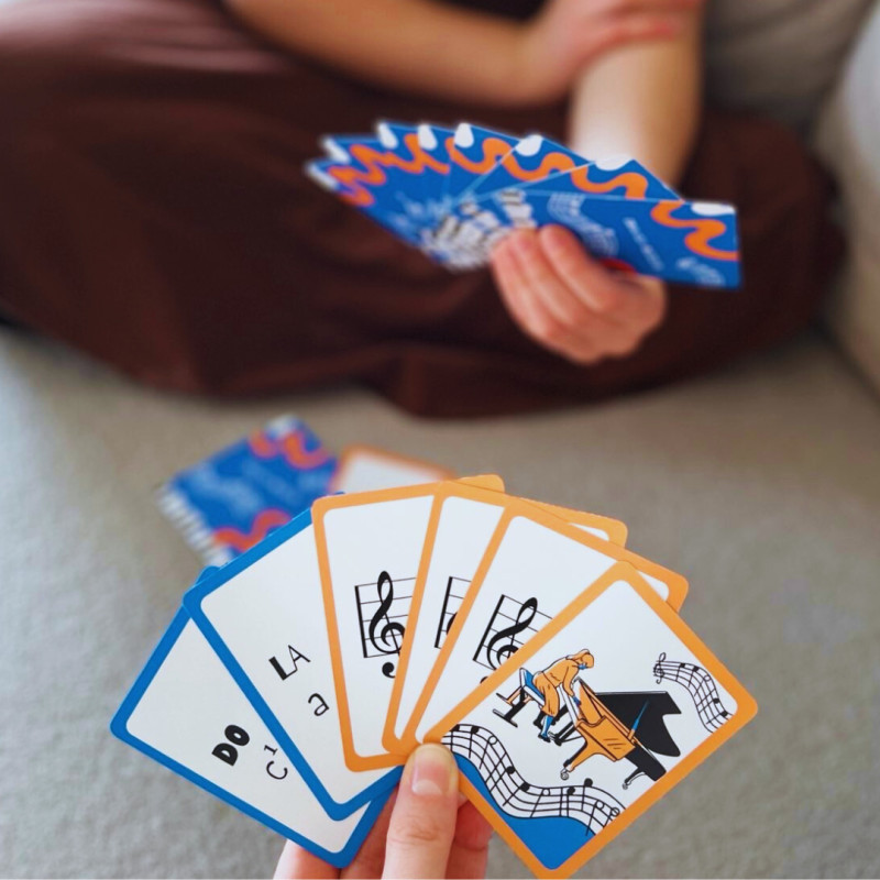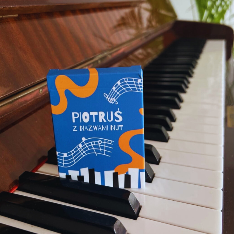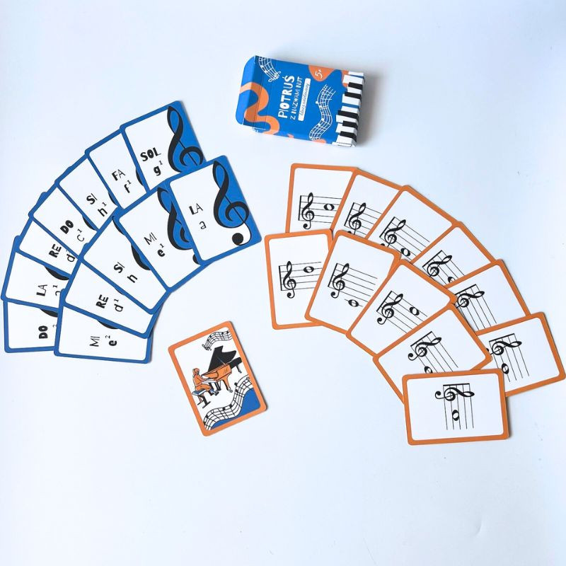 W tekturowym pudełku znajdziesz: 12 pomarańczowych kart z nutami na pięciolinii, 12 niebieskich kart z nazwami nut i 1 kartę Piotruś. Zaproś do zabawy dzieci powyżej 5 roku życia, które zaczynają naukę nazw nut lub potrzebują powtórki czy utrwalenia. Piotruś – muzyczna gra z nazwami nut to kwintesencja nauki przez zabawę.