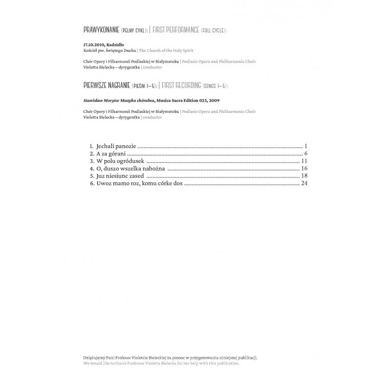 Sześć pieśni kurpiowskich Stanisława Moryty to cykl utworów przeznaczonych na chór mieszany a cappella. Podobnie jak inni twórcy czerpiący z tradycji muzycznej Kurpiowszczyzny (Karol Szymanowski, Roman Maciejewski, Romuald Twardowski, Paweł Łukaszewski), Moryto, nadając swoim utworom artystyczne, indywidualne brzmienie, sięgnął po autentyczne, ludowe melodie i teksty z trzytomowego zbioru ks. Władysława Skierkowskiego Puszcza kurpiowska w pieśni, o którym sam Szymanowski pisał, że odkrył „niezmiernie bogate źródło polskiej pieśni”. Cykl Moryty pokazuje, że tradycyjne formy muzyczne można reinterpretować w sposób, który nie tylko zachowuje ich pierwotne piękno, lecz także pozwala na ich odczytanie w nowym kontekście artystycznym. Proste, ale zarazem pełne emocji melodie za sprawą mistrzostwa warsztatu kompozytorskiego poruszają i oddają charakter kurpiowskiego folkloru. Paweł Łukaszewski