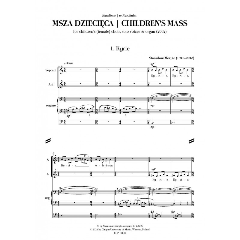 Msza dziecięca na chór dziecięcy (żeński), głosy solowe i organy powstała w 2002 roku jako muzyczny podarunek dla Karoliny Kyci (obecnie Miki) – jednej z pierwszych trojga absolwentów specjalności muzyka kościelna w ówczesnej Akademii Muzycznej im. Fryderyka Chopina w Warszawie (obecnie Uniwersytet Muzyczny Fryderyka Chopina). Została prawykonana 1 czerwca 2002 roku w kościele pw. św.św. Apostołów Piotra i Pawła (parafia św. Barbary) w Warszawie podczas mszy dyplomowej Kyci (pełniącej wówczas rolę dyrygentki). Partie solowe wykonały Bernadetta Gołębiowska i Agata Wrońska, śpiewał Żeński Zespół Wokalny Wydziału Edukacji Muzycznej AMFC, a przy organach zasiadł Michał Sławecki. Msza dziecięca jest cyklem typu missa brevis, zawierającym cztery części ordinarium missae: Kyrie, Gloria, Sanctus, Agnus Dei. Partia chóralna oscyluje pomiędzy brzmieniem jednogłosu a fakturą czterogłosową, z kolei w częściach Gloria, Sanctus i Agnus Dei towarzyszą jej głosy solowe (sopran i alt). Skromny tytuł skrywa kompozycję opartą na bogatej harmonice, przepełnioną różnorodnością faktur oraz szlachetną inwencją melodyczną, którą obserwujemy zarówno w partiach wokalnych, jak i towarzyszącej głosom partii organów. Karolina Mika
