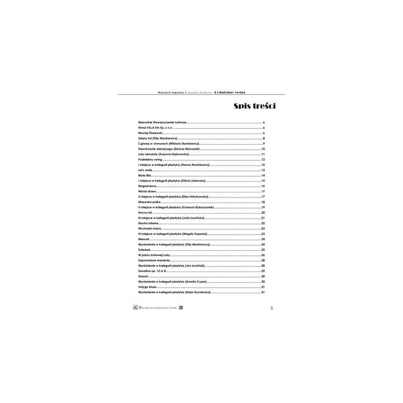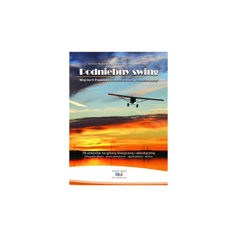 Z radością oddajemy w Państwa ręce wydawnictwo promujące prace utalentowanych ełczan. Spełnia też ono inne cele: promuje lotnictwo, piękno Mazur i nasze miasto - historyczną stolicę regionu. Serdecznie dziękuję mecenasowi wydania, Panu Maciejowi Olszewskiemu. Jest on właścicielem firmy FALA Ełk Sp. z o.o. oraz Prezesem Mazurskiego Stowarzyszenia Lotniczego. To właśnie w ramach X jubileuszu stowarzyszenia odbyły się konkursy: plastyczny, kompozytorski i literacki. Pierwotnie niniejszy zeszyt miał zawierać kilkanaście moich kompozycji na gitarę wraz ze zdjęciami. Jednak kiedy zobaczyliśmy piękne rysunki, wiersze i opowiadania, zdecydowaliśmyo publikacji prac laureatów. Zbiór utworów pt.: „Podniebny Swing” adresowany jest do muzyków grających na każdym rodzaju gitary: od klasycznej, przez akustyczną, do elektrycznej. Mam nadzieję, że kompozycje taneczne, takie jak: blues, swing czy fingerstyle, zachęcą do improwizacji i poszukiwań nowych brzmień. Fotografie i rysunki nawiązują do walorów naszego miasta i regionu. Podobnie jest z Muzyką. Grając walc pt.: „W parku królowej Luizy”, proszę sobie wyobrazić przelot nad parkiem w centrum Ełku (przez 150 lat park nosił imię Królowej Pruskiej. Obecnie - Park Solidarności). Arietta pt.: „Biała lilia” to lirycznie, niemal wokalnie przedstawiony widok jeziora z lotu ptaka. Warte uwagi są dwie kompozycje moich uczniów: Wiktorii S. pt.: „Z głową z chmurach” i Filipa M. pt.: „Udany lot”. Mamy nadzieję, że to udana forma wyróżnienia dzieci i młodzieży, a także trwała pamiątka dla rodzin uczestników oraz interesujący prezent dla gości odwiedzających nasze miasto. Oby w przyszłości, na styku Biznesu i Kultury, mogły powstawać kolejne prace dokumentujące działalność mieszkańców i ich wkład w rozwój miasta i regionu. Wojciech Popielarz