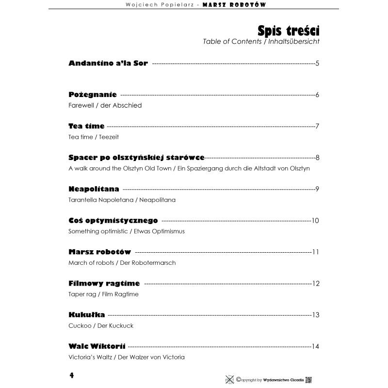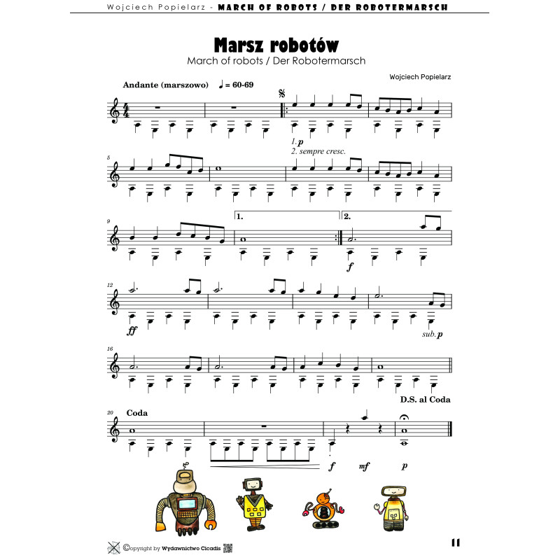 Drogi Gitarzysto! Dziękuję za zainteresowanie zbiorem nut wydawnictwa Cicadis[...]. Te dziesięć kompozycji napisałem właśnie dla Ciebie, dla gitarzysty pełnego pasji, rozpoczynającego przygodę z Muzyką. Większość prezentowanych miniatur była już wykonywana i wysoko oceniana na konkursach i przesłuchaniach CEA. Pierwsze z nich są łatwe. Puść więc wodze fantazji i bądź kreatywny! Pracując nad tytułowym „Marszem robotów”, wyobraź sobie, że tworzysz ilustrację do gry Minecraft. Grając „Pożegnanie”, zobacz przyjaciela, który wsiada do pociągu i za chwilę odjedzie. „Ragtime” przeniesie Cię w świat dawnego kina i filmu niemego. Interpretując „Kukułkę” - poczuj zapach lasu, szum drzew i odgłosy ptaków. Utwory możesz dowolnie modyfikować. Jeśli podoba Ci się jakaś część, możesz ją powtórzyć, jeśli jest zbyt złożona, pomiń ją. Zagrasz, kiedy wzrosną Twoje umiejętności. Niektóre utwory, chociaż wymagają nieco więcej doświadczenia, odkryją przed Tobą bogaty świat rytmów i melodii. Oprócz pozyskania atrakcyjnego i popisowego repertuaru, udoskonalisz wiele elementów techniczno-wyrazowych, takich jak gra legato, staccato, zmiany pozycji i rejestrów, tłumienie strun, wprowadzenie do fingerstyle. [...] Wojciech Popielarz