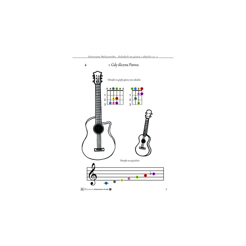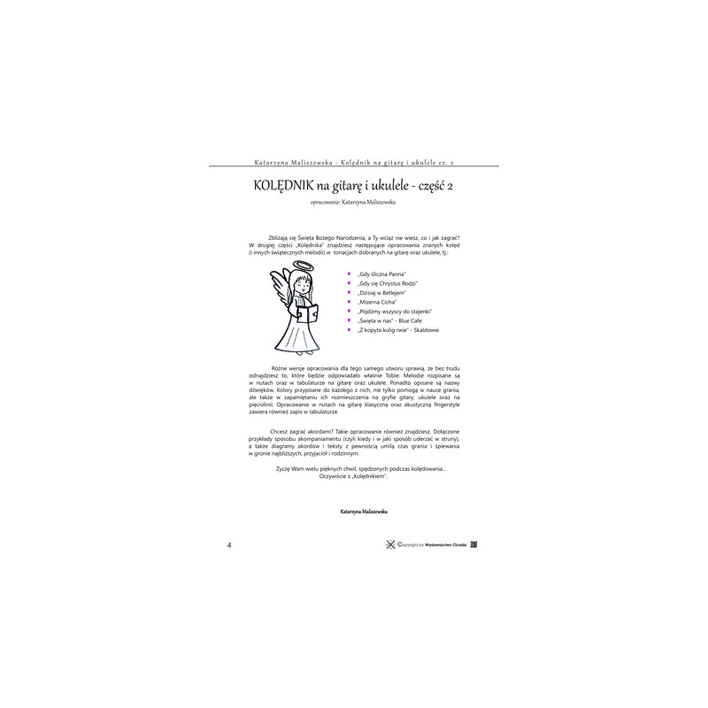 Różne opracowania dla tego samego utworu sprawiają, że bez trudnu odnajdziesz to, które będzie odpowiadało właśnie Tobie. Melodie rozpisane są w nutach oraz w tabulaturze na gitarę i ukulele. Ponadto opisane są nazwy dźwięków. Kolory przypisane do każdego z nich nie tylko pomogą w nauce grania, ale także w zapamiętaniu ich rozmieszczenia na gryfie gitary, ukulele i na pięciolinii. Opracowanie w nutach na gitarę klasyczną oraz akustyczną fingerstyle zawiera również zapis w tabulaturze. Chcesz zagrać akordami? Takie opracowanie również znajdziesz. Dołączone zostały przykłady akompaniamentu ( czyli kiedy i w jaki sposów uderzać w struny), a także diagramy akordów i teksty z pewnością umilą czas grania i śpiewania w gronie najbliższych, przyjaciół i rodzinnym. Życzę Wam wielu pięknych chwil spędzonych podczas kolędowania... oczywiście z Kolędnikiem. Katarzyna Maliszewska