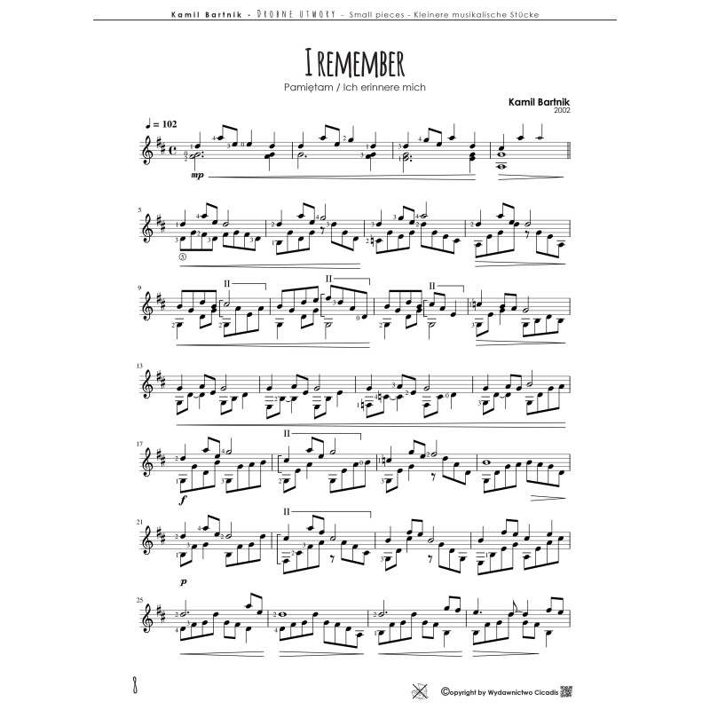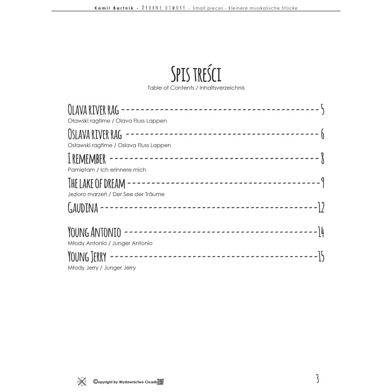 Zbiór Drobne utwory zawiera kompozycje w większości o charakterze pop i fingerstyle dla mniej zaawansowanych gitarzystów. Zbiór Drobne utwory zawiera kompozycje w większości o charakterze pop i fingerstyle dla mniej zaawansowanych gitarzystów. I Remember, The Lake of Dream to miniatury nawiązujące do muzyki pop. Olawa River Rag, Oslawa River Rag to typowe kompozycje fingerstyle dedykowane pedagogom gitarzystom. Young Jerry i Young Antonio to utwory inspirowane artystami: pianistą, wokalistą i autorem piosenek rockabylli/rock and roll Jerry Lee Lewis`em oraz kompozytorem w stylu bossa – nova Antonio Carlos Jobimem. Gaudina to arpeggiowa miniatura dedykowana właściwie dwóm osobom. Gaudina to nazwa mistrzowskiej gitary lutniczej inspirowanej stylem architektury Antonio Gaudiego wykonanej przez lutnika Bogusława Teryksa. Właścicielem tego instrumentu jest Wojciech Krasecki, mecenas sztuki. Na tym instrumencie Kamil Bartnik nagrał w 2000 roku płytę CD z utworami holenderskiej kompozytorki Anette Kruisbrink.Kamil Bartnik