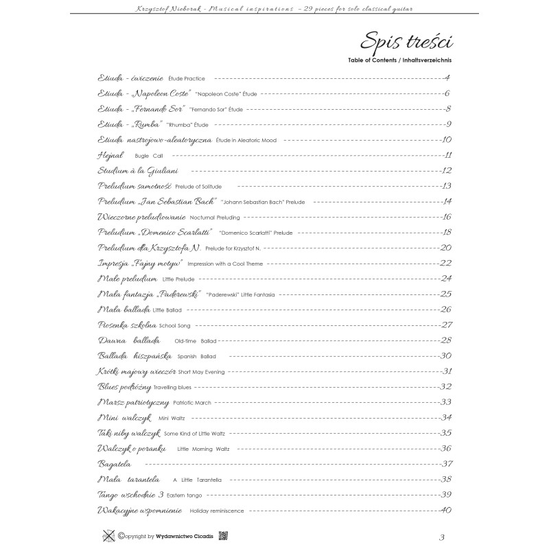 Publikacja zawiera 29 utworów, z których część powstało pod wpływem kompozycji znanych autorów jak Paderewski, Scarlatti, Sor, Coste czy Bach i wykorzystują którkie fragmenty znanych tematów oraz charakterystyczne rytmy.